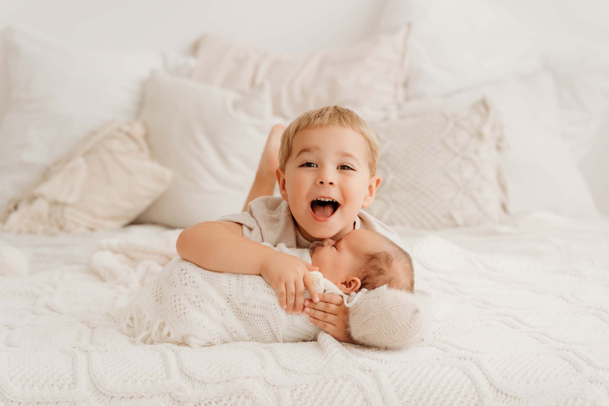 Wir nehmen uns die Zeit, damit euer Kind mich kennenlernen kann und Vertrauen entsteht. Gemeinsam lassen wir ganz spielerisch und leicht Herzensmomente in der Neugeborenenfotografie mit Geschwisterkinder entstehen – ob beim Fliegerspielen mit Papa, Hüpfen auf dem Bett oder Kuscheln mit Mama. Auch kleine, spaßige Aufgaben wie „Wer findet die versteckten Mini-Marshmallows?“ oder „Wer kann Mama und Papa am besten kitzeln?“ lockern die Stimmung.